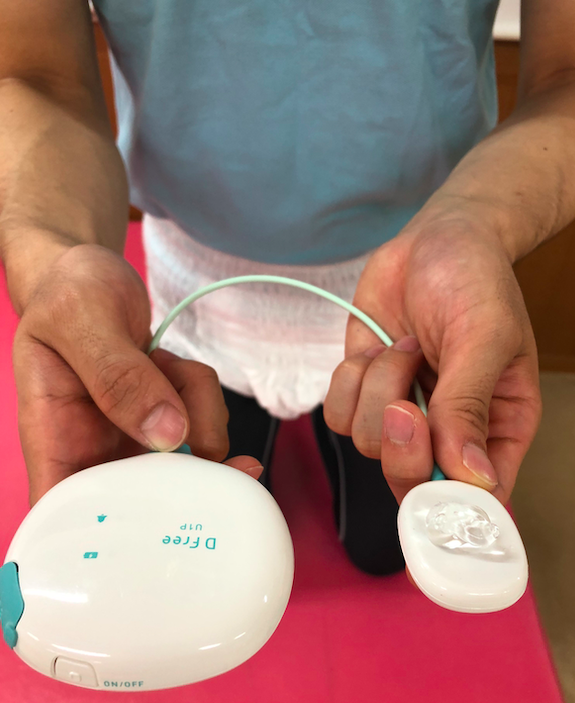 少し分かりにくいですが、恥骨の1〜2センチ上あたりに、ジェルをつけたDfreeのセンサーを貼り付けます。
